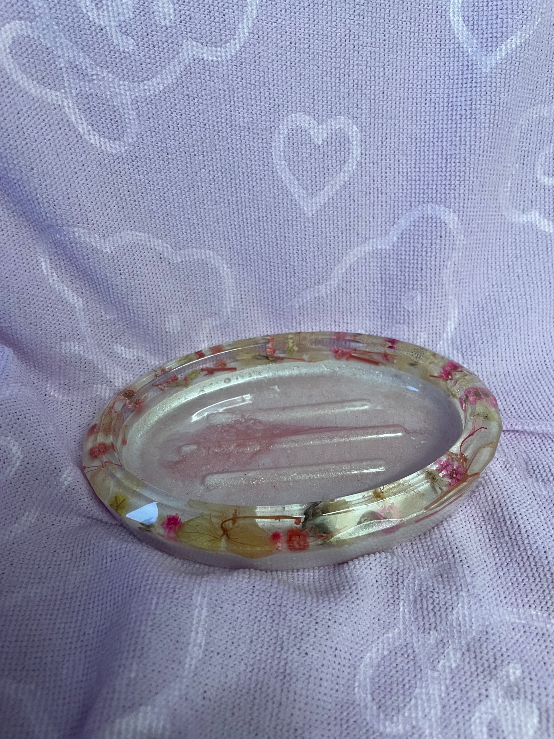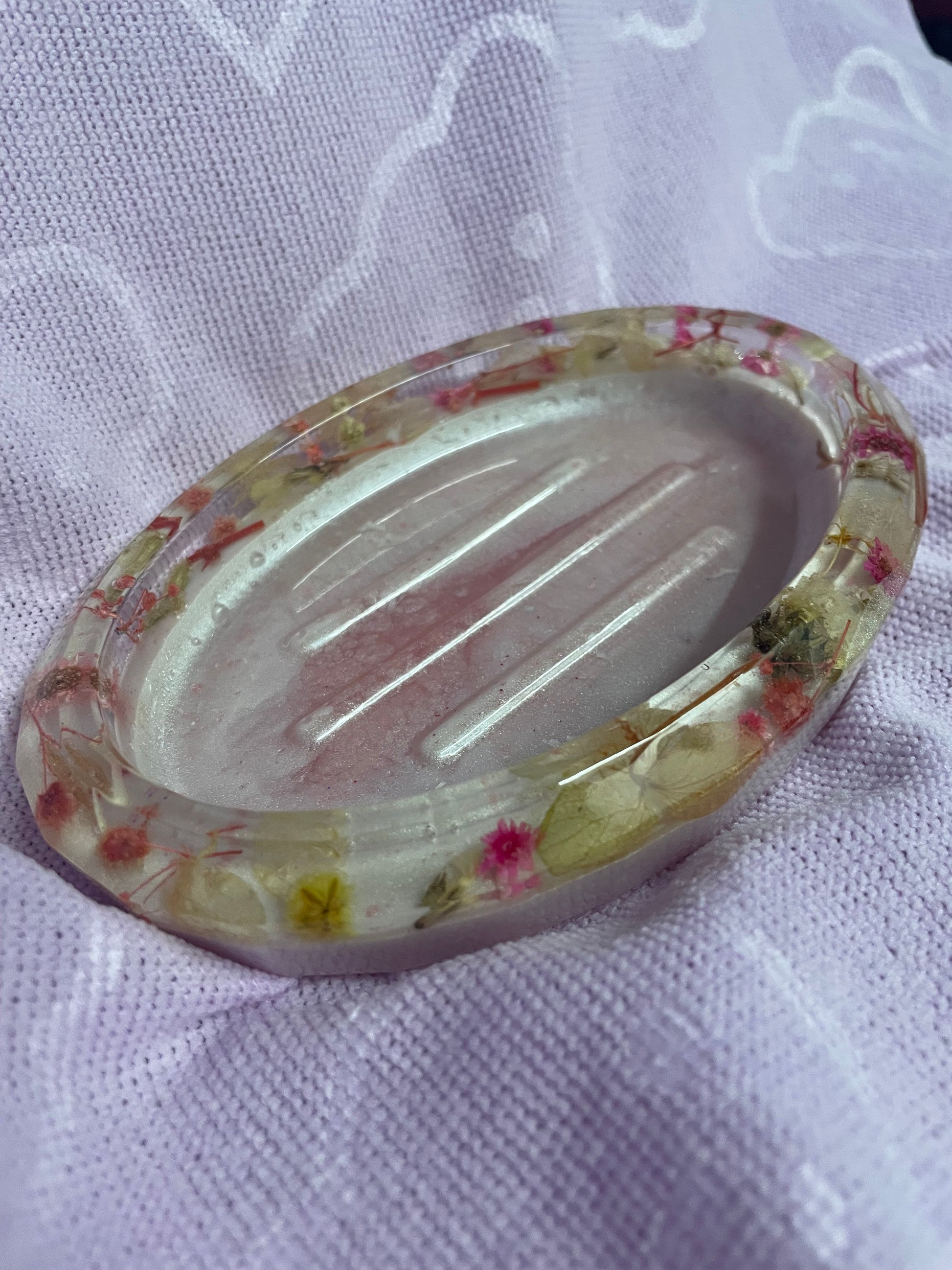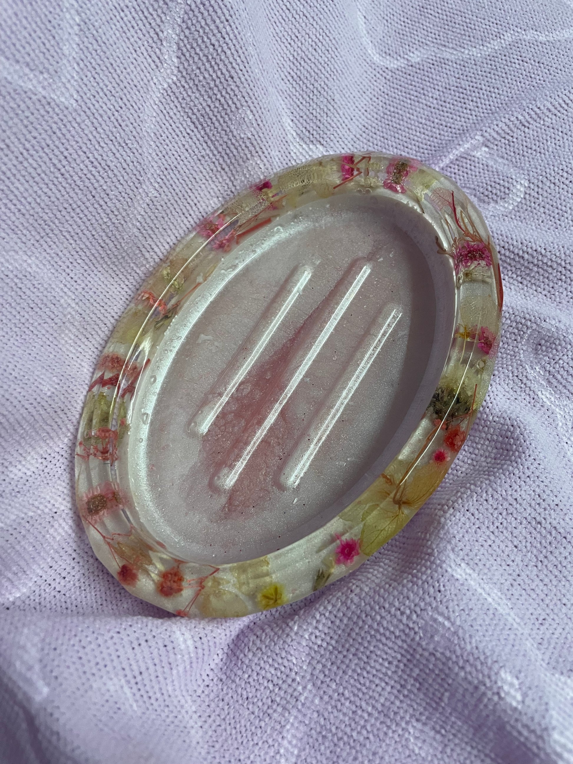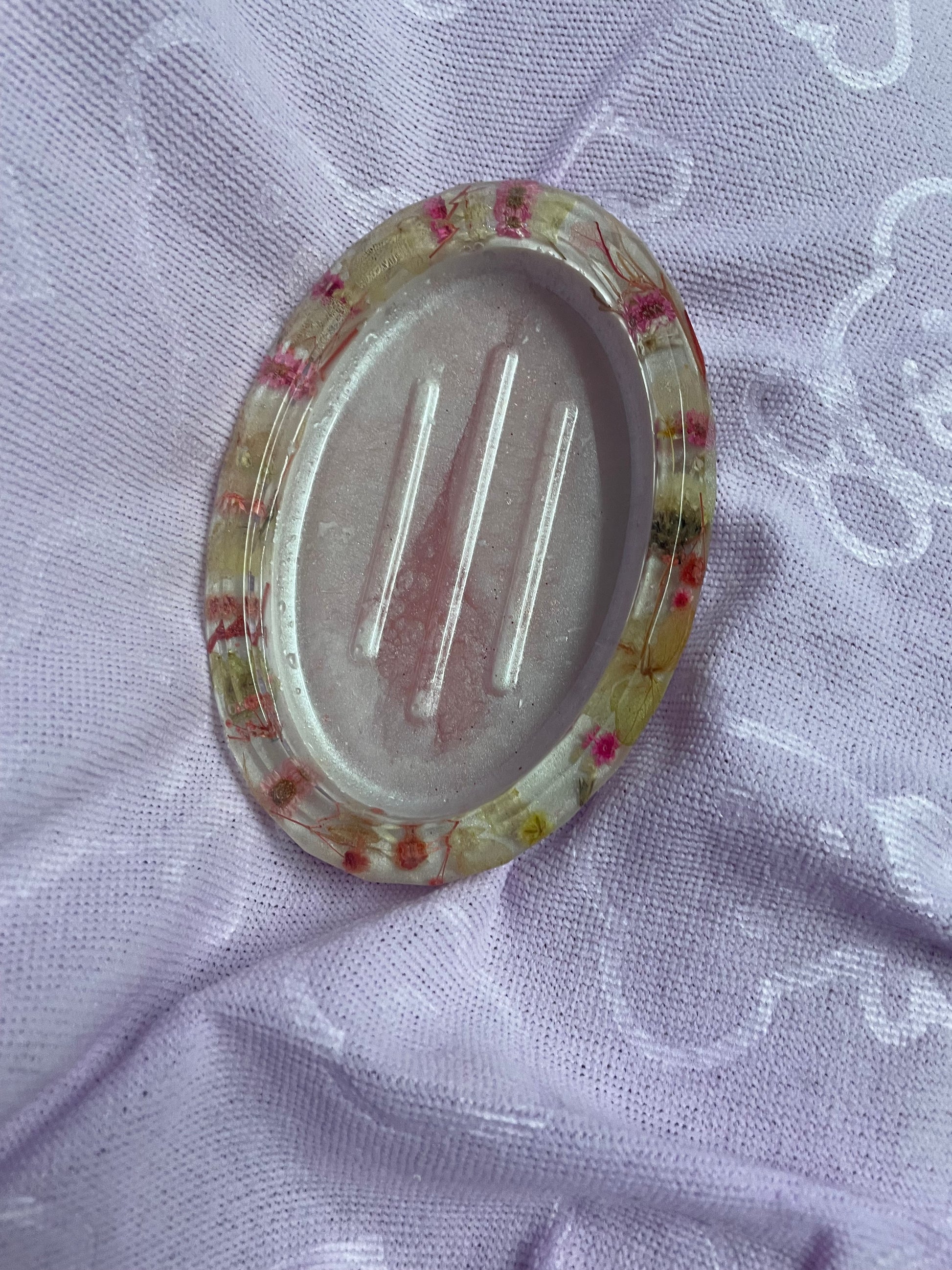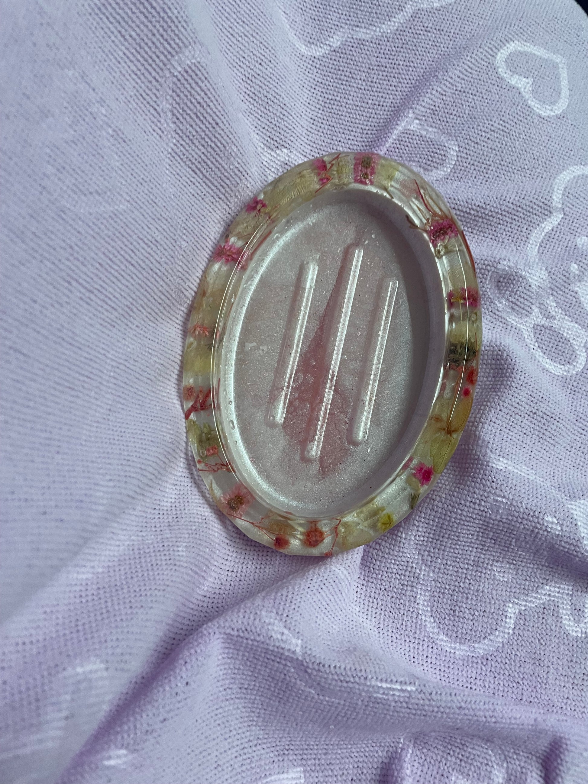 Breng een vleugje elegantie en natuur in je badkamer met dit prachtige handgemaakte zeepbakje van epoxy. De rand is versierd met echte bloemetjes die in transparante epoxy zijn gegoten, terwijl de bodem een zachte kleur heeft die het geheel perfect in balans brengt.