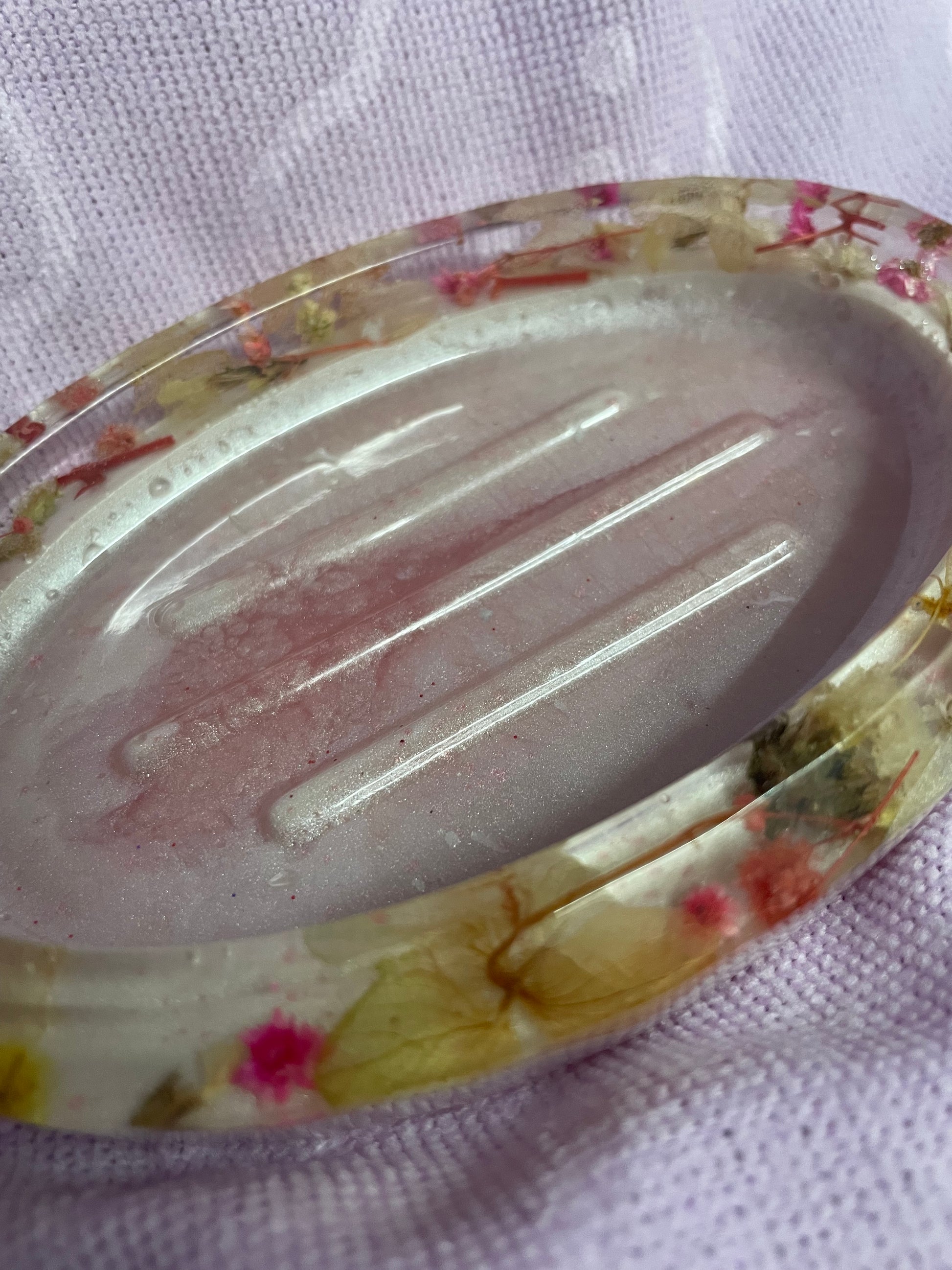 Elk zeepbakje is uniek – de plaatsing van de bloemetjes en de kleurcombinatie maken ieder exemplaar tot een klein kunstwerkje. De epoxy zorgt voor een glanzende, waterbestendige afwerking, waardoor het niet alleen mooi maar ook praktisch is voor dagelijks gebruik.
