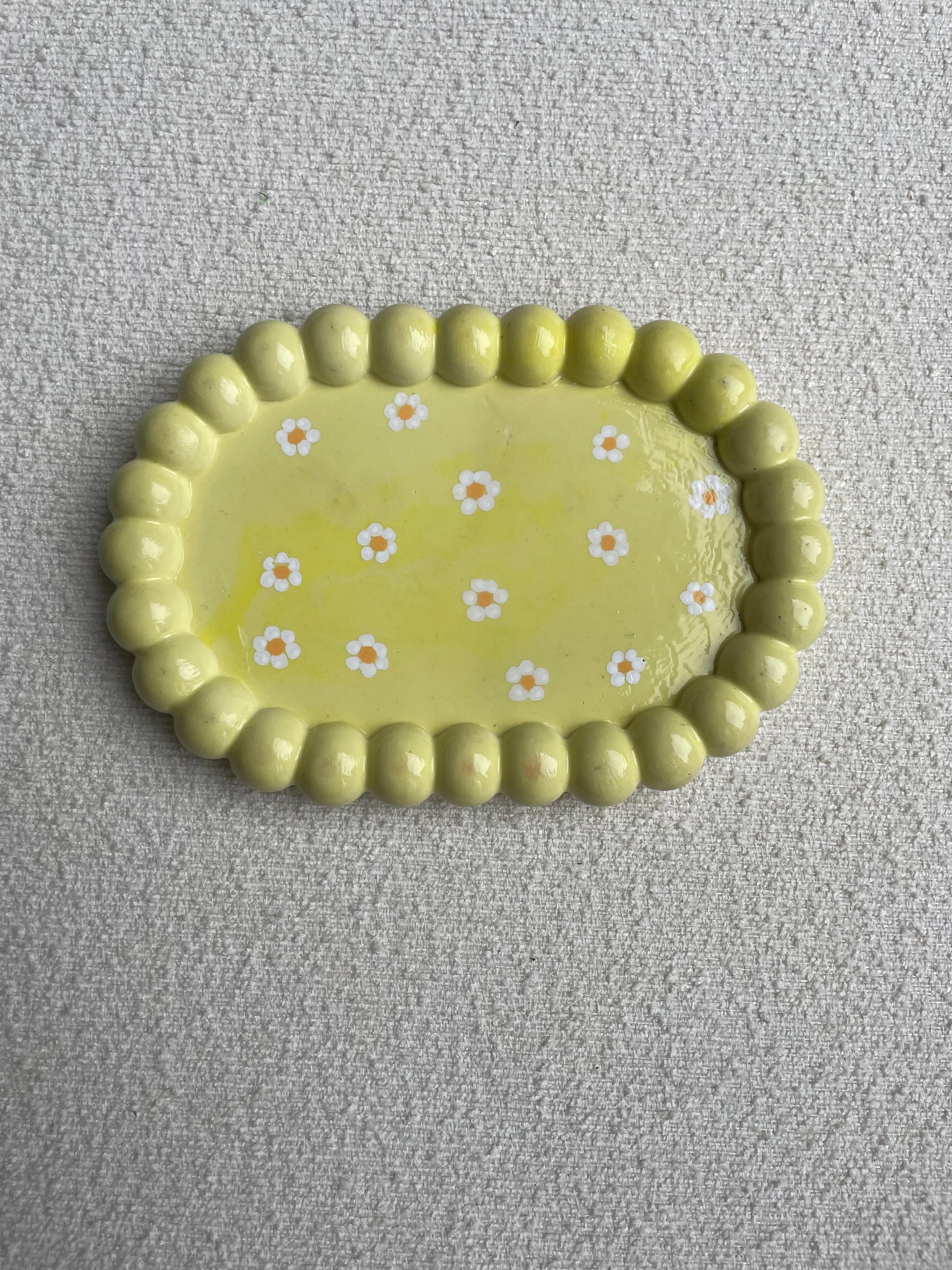 Dit zonnige gele sieradenschaaltje, met een lieflijk randje van bolletjes en witte bloemetjes als decoratie, fleurt elke ruimte op. Perfect voor het bewaren van je favoriete ringen, oorbellen of andere kleine schatten.