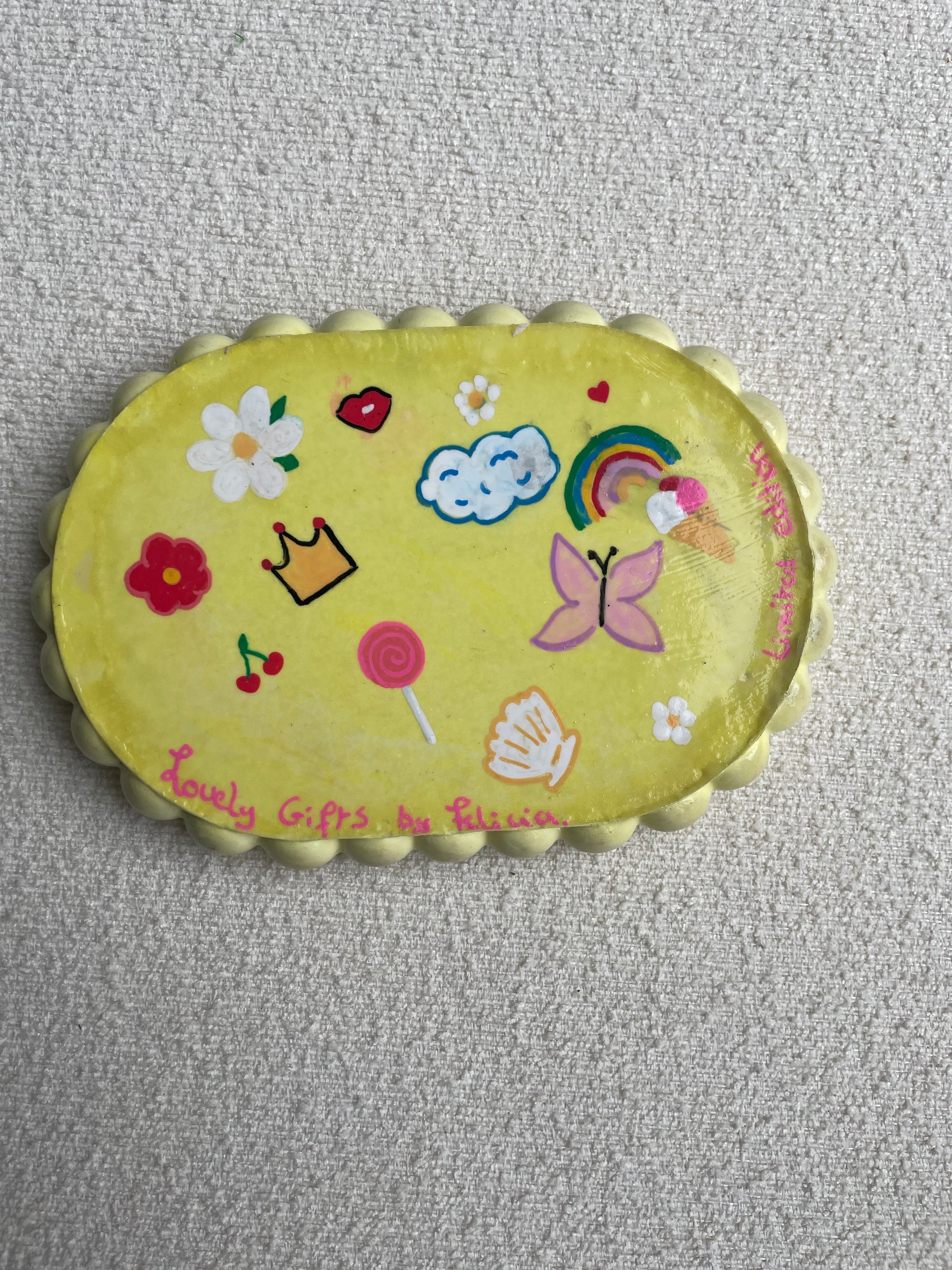Flawesome alert: Aan de onderkant staan allerlei tekeningetjes die ik een keer maakte tijdens een live workshop om te laten zien hoe je op dit materiaal kunt tekenen. Het schaaltje is verder helemaal gaaf en een uniek stukje creativiteit! Zie het maar als een limited edition.