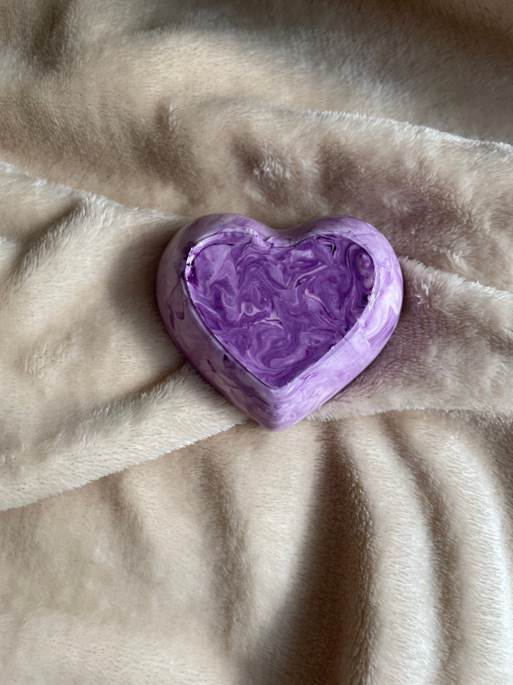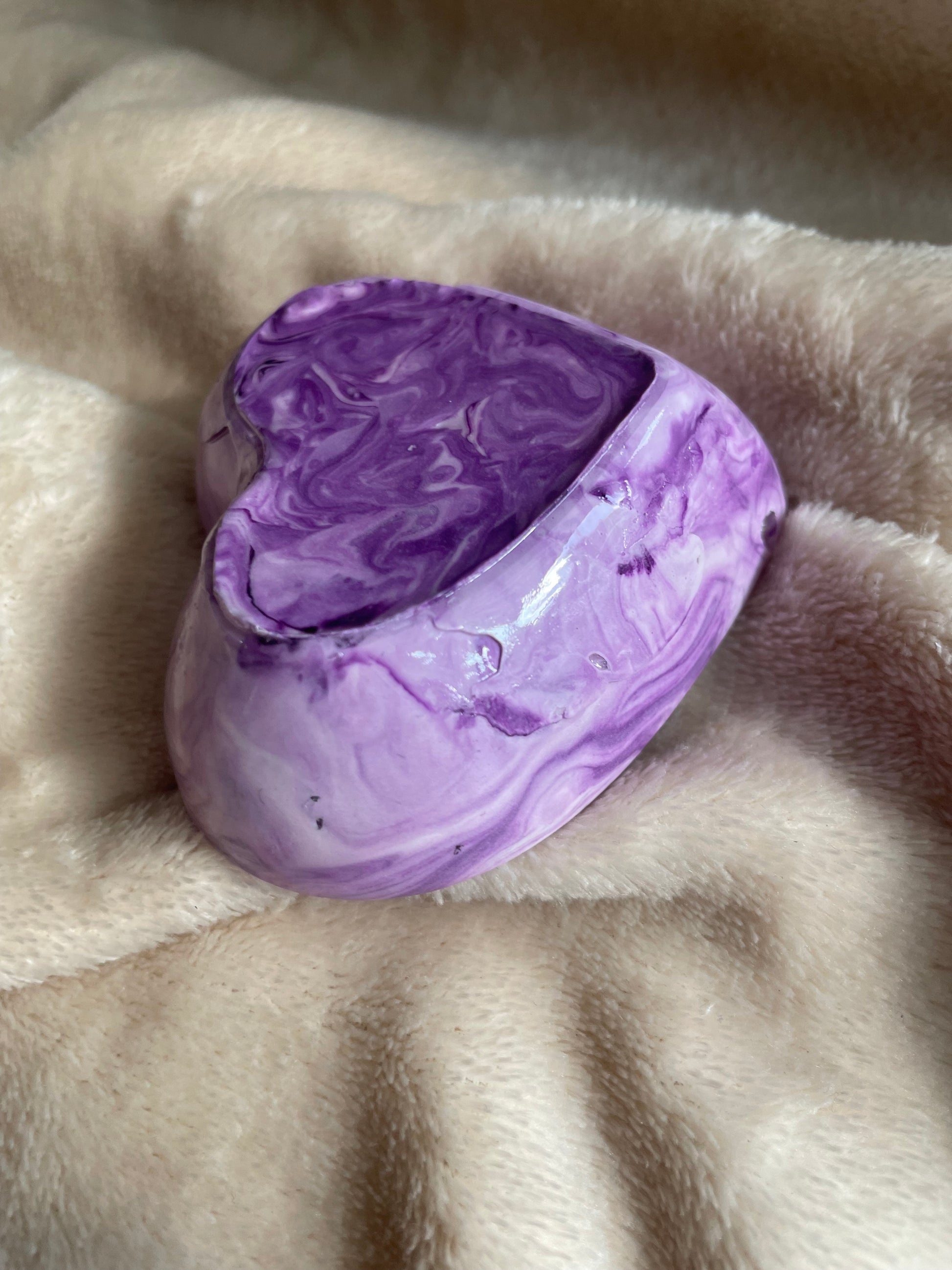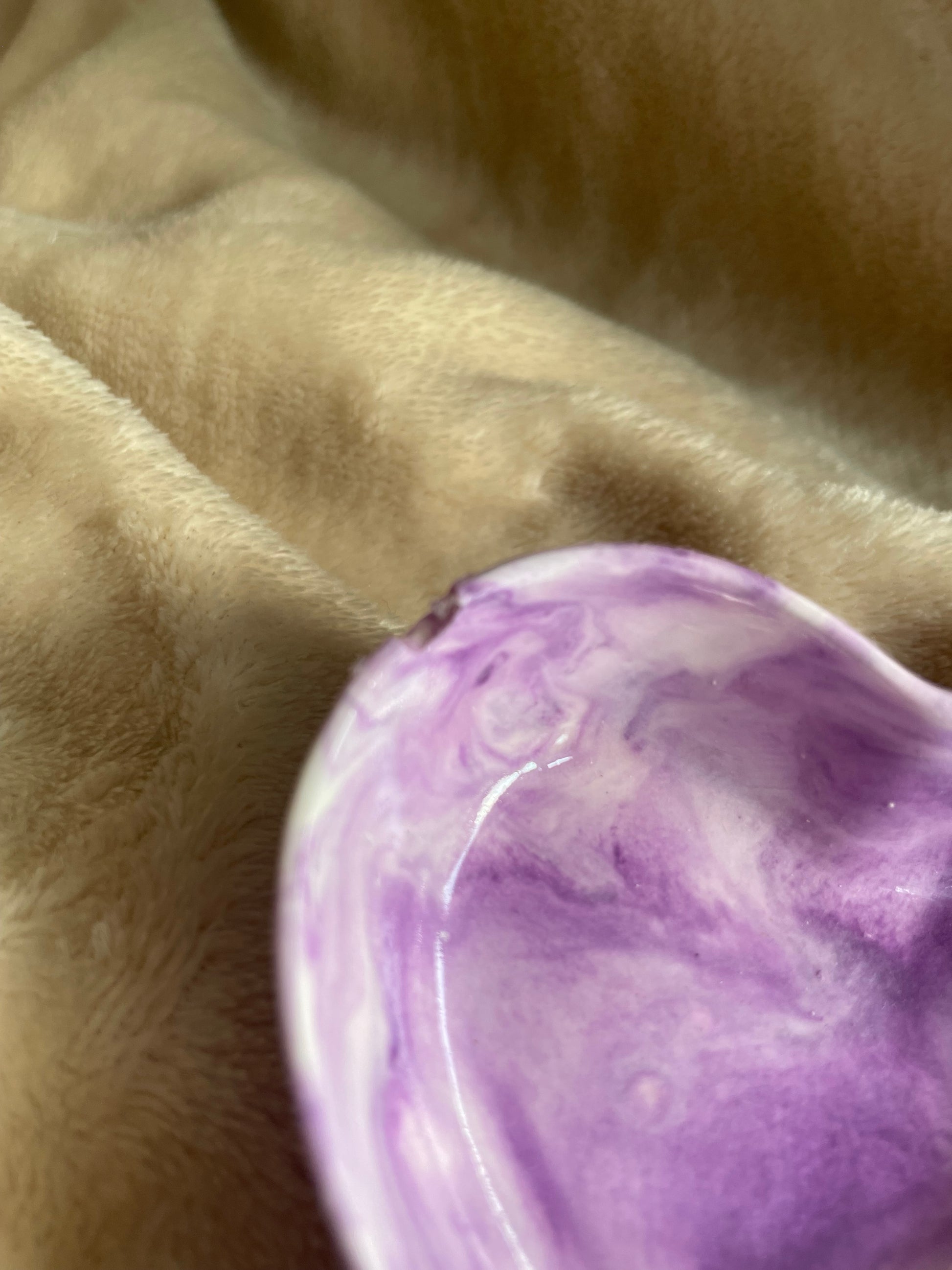 Met een zachte paarse marmerlook is dit schaaltje ideaal om ringen, oorbellen of kleine schatten in te bewaren. Aan de zijkant zit een lichte onregelmatigheid én een klein gaatje in de rand (zie foto), wat het niet minder functioneel maakt – maar wel uniek. Perfect voor wie van handgemaakt houdt en het niet erg vindt dat niet alles perfect glad is.